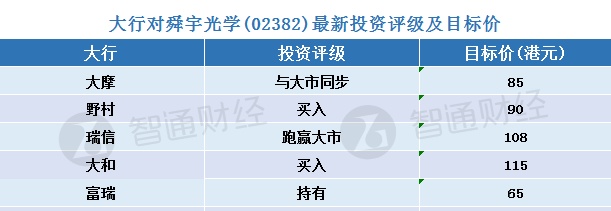 四、大行对舜宇光学(02382)最新投资评级及目标价汇总