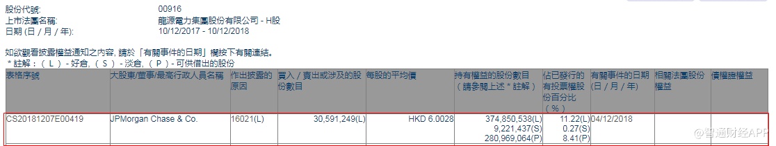 智通财经APP获悉,根据联交所资料显示,摩根大通于12月4日增持龙源电力(00916)3059万股,每股作价6.0028港元,总值1.84亿港元,最新持股量增至11.22%。