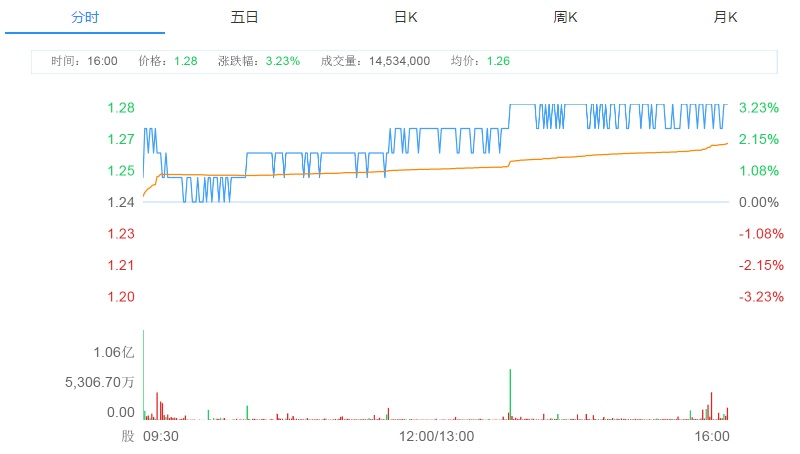 截至今日收盘,中国铁塔涨3.23%,报1.28港元。