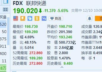 智通财经APP获悉,联邦快递(FDX.US)跌逾5%。