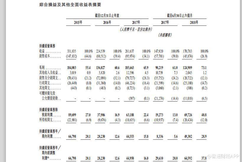 据招股书披露,于2015年、2016年、2017年,我们持续经营业务的收益合共分别为3.318亿元(人民币,下同)、人民币2.245亿元及2.816亿元。截至2017年纪2018年6月30日止六个月,我们持续经营业务的收益合共分别为1.479亿元及1.708亿元。
