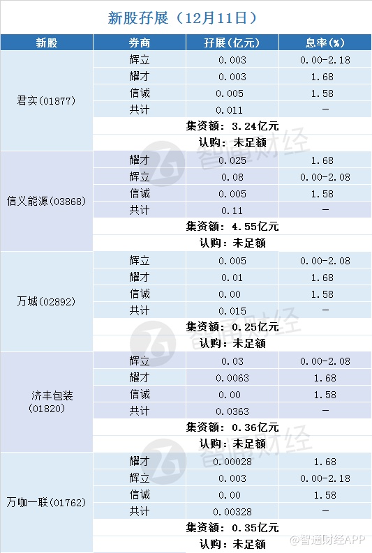 智通财经APP获悉,君实(01877)、信义能源(03868)、万城(02892)、济丰包装(01820)和万咖一联(01762)正在招股中。截至12月11日,辉立、耀才、信诚等多家券商为他们分别借出0.011亿、0.11亿、0.015亿、0.0363亿和0.00328亿孖展金。