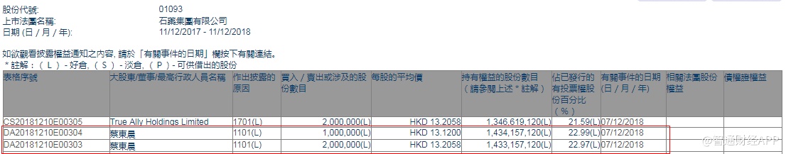 智通财经APP获悉,根据联交所资料显示,蔡东晨于12月7日增持石药集团(01093)300万股,分别作价13.12港元和13.2058港元,总值3953.16万港元,最新持股数增至143415.71万股,最新持股比例增至22.99%。