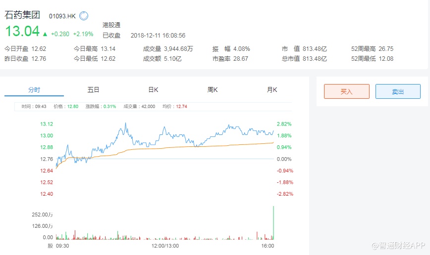 截至今日收盘,石药集团(01093)报13.04港元,涨2.19%。