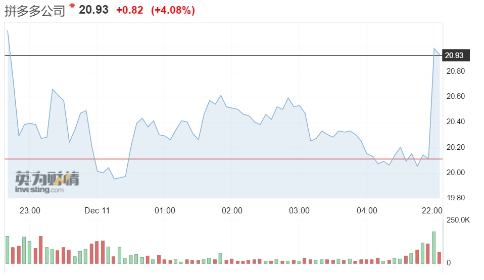 智通财经APP获悉,拼多多股价于美股周二开盘拉升4.43%,截至发稿涨4.08%,报20.93美元。