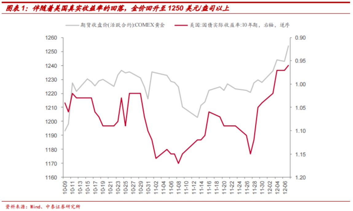 根据中泰证券研究,进入十二月,美国真实收益率快速回落,非农就业人口、密歇根大学CSI指数各种不达预期和创新低,通胀预期走弱,鲍威尔更是近乎“官宣”了加息预期不足,高盛等大行迅速跟进下调,一顿操作之后,金价已经回升到1250美元/盎司之上。