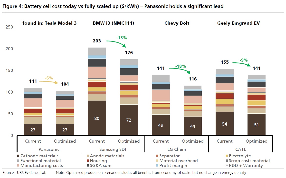 瑞银认为,随着韩国和中国的动力电池厂商扩大规模,未来2~3年松下电池的成本领先优势可能缩小至10%左右,当然松下和特斯拉也不会止步不前,但随着更多厂家在2020年后NMC811电池成为主流,差距会进一步收窄。