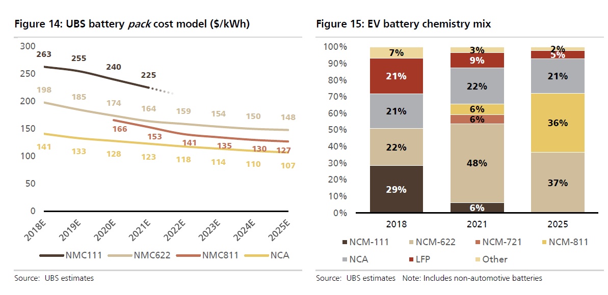 在电池技术路线上,走NCA路线还是NCM路线仍存在争议。国内新能源汽车使用的三元锂电池以镍钴锰NCM电池为主,特斯拉使用的是镍钴铝NCA三元锂电池。虽然特斯拉的NCA能量密度高,成本也更低,但瑞银认为,未来大多数现有企业会采用NCM三元锂电池。