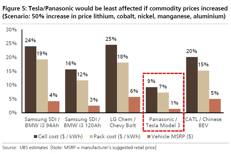 若考虑原材料因素,瑞银预计,只要原材料(尤其是钴)价格不大幅下跌,特斯拉/松下电池将保持领先地位。如果钴价进一步上涨,特斯拉/松下的优势可能会得到巩固,因为它的钴含量相对较少。但需要注意的是,特斯拉/松下电池阴极镍含量较高,镍价上涨对特斯拉/松下公司的影响要比其它公司稍微大一些。