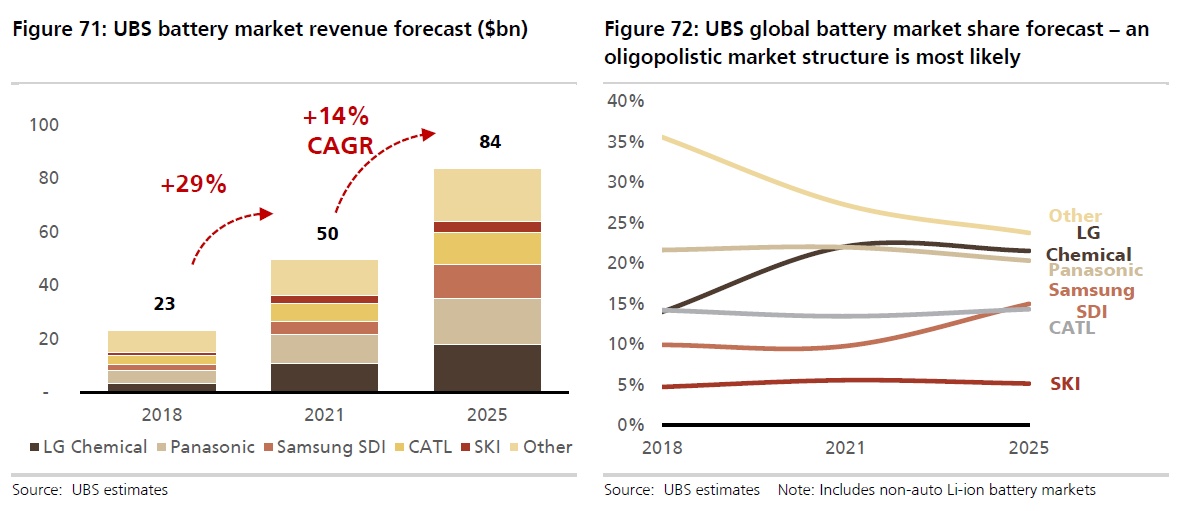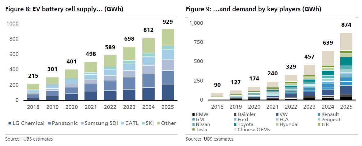 基于此,瑞银预计全球电动汽车动力电池需求将以9.5倍的增速,从2018年的93GWh增长到2025年的973 GWh(相当于19家Tesla Gigafactory),高于总体电池行业需求的6倍增速,后者预计将从2018年166GWh增长到2025年的1145GWh。