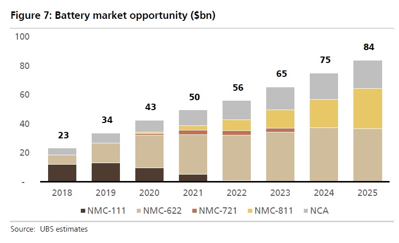 随着电动车电池市场不断扩大,NMC811电池被更广泛采用,瑞银认为,镍的需求增长最快,预计2025年电动汽车对镍的需求将增加至665kt,大概相当于2018年预估需求的11倍。
