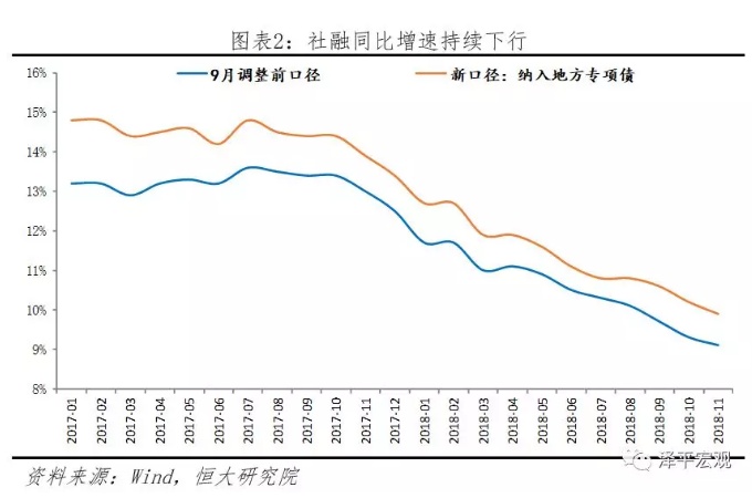 1、社融规模略超预期,但实体融资形势仍紧,M2增速维持历史低位,M1增速持续下行。11月新增社会融资规模1.52万亿人民币,环比增加7903亿元,较去年同期少增3948亿元,较10月社融同期萎缩幅度4716亿元有所减小。然而新口径社融存量持续下行,11月社融同比9.9%,剔除地方专项债口径同比由10月9.3%再次下探至9.1%的历史低点。M2同比增速维持8%历史低位,而M1同比增速连续第5个月下滑至1.5%。