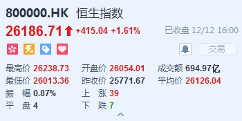 智通财经APP获悉,恒指早盘收复两万六关口,高开1.1%,报26054.01点。截至收盘,恒生指数涨415.04点或1.61%,报26186.71点,全日成交额达694.97亿。国企指数涨1.68%,报10417.16点,红筹指数涨2.25%,报4307.1点。