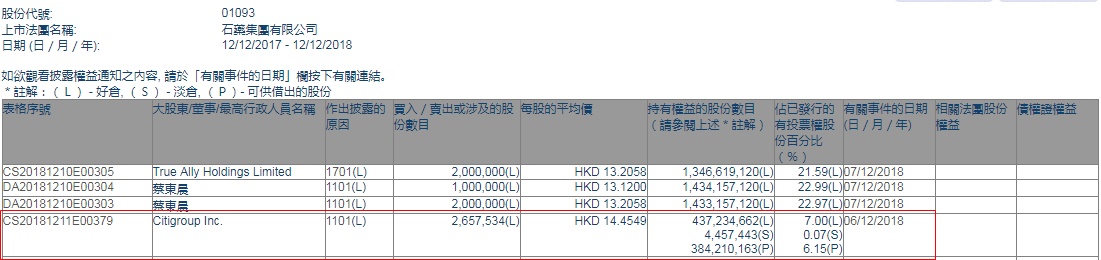 智通财经APP获悉,根据联交所资料显示,花旗集团于12月6日增持石药集团(01093)265万股,每股作价14.4549港元,总值3830.55万港元,最新持股数增至43723.47万股,最新持股比例增至7%。