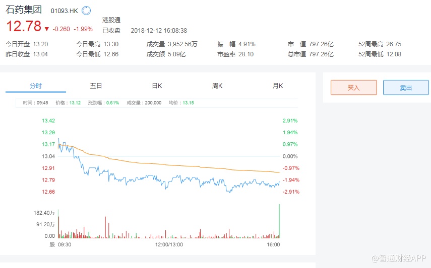 截至今日收盘,石药集团(01093)报12.78港元,跌1.99%。