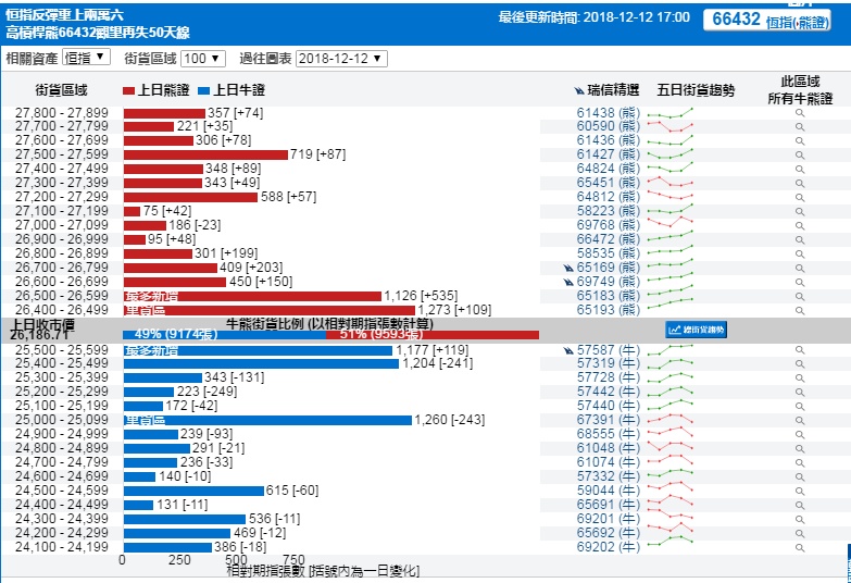 智通财经APP获悉,截至12月12日,恒指最新的牛熊街货比例49:51。从瑞信恒指牛熊证街货分布图中得到的数据显示,熊证街货重货区在26400-26499区间,该区间熊证数量为1273张,比上一交易日增加109张;最多新增在26500-26599区间,新增535张。牛证中重货区在25000-25099区间,该区间最新牛证数量为1260张,比上一交易日减少243张;最多新增在25500-25599区间,新增119张。