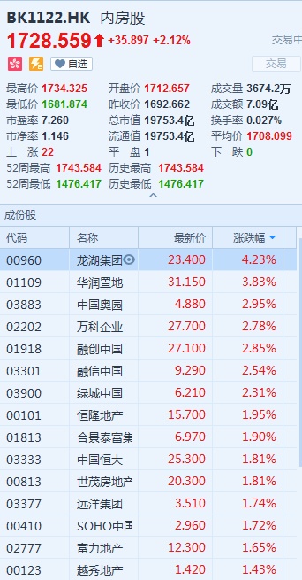 其他个股方面,华润置地(01109)升3.83%,奥园(03883)升2.95%,万科企业(02202)升2.78%,融创(01918)升2.85%,融信(03301)升2.54%,绿城(03900)升2.31%。