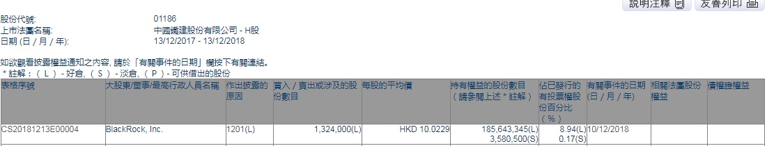 智通财经APP获悉,根据联交所资料显示,贝莱德于12月10日减持中国铁建(01186)132万股,每股作价10.0229港元,总值1323.02万港元,最新持股数减至18564.33万股,最新持股比例减至8.94%。