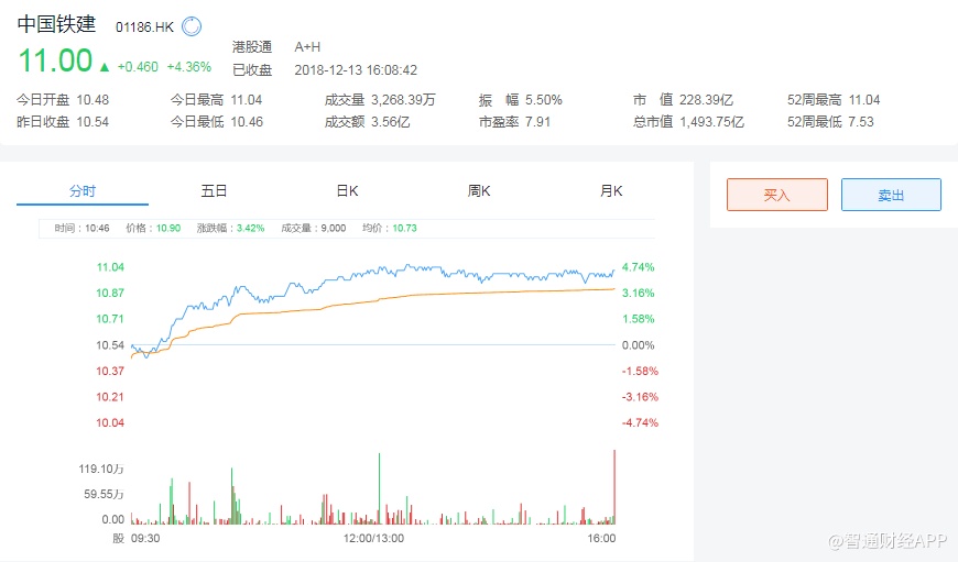 截至今日收盘,中国铁建(01186)报11港元,涨4.36%。