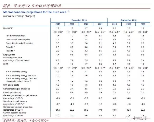 经济预测:下调2018/2019年增长预测,显示欧央行确认欧元区增长动能弱于预期。与我们在预览报告中预计的一致[1],欧央行下调2018年实际GDP增速预测0.1个百分点至1.9%,以反映3季度增长不及欧央行预计的0.4%这一事实;下调2019年GDP增速0.1个百分点至1.7%,显示其开始计入明年增长放缓;引入2021年GDP预测,预测增速1.5%。同时,欧央行上修2018年CPI通胀0.1个百分点至1.8%,但下修2019年CPI通胀0.1个百分点至1.6%。