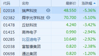 智通财经APP获悉,国内前11月手机出货量下滑近两成,手机产业链遭遇“寒冬”,截至15时55分,舜宇光学(02382)跌5.1%,丘钛科技(01478)跌3.42%,高伟电子(01415)跌2.94%。
