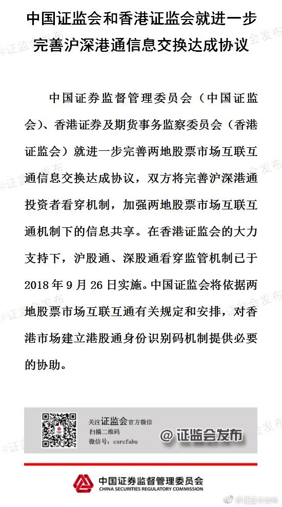 中国证监会和香港证监会就进一步完善沪深港通信息交换达成协议