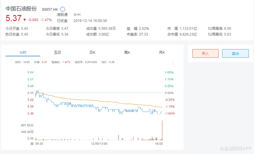 截至今日收盘,中国石油股份(00857)报5.37港元,跌1.47%。