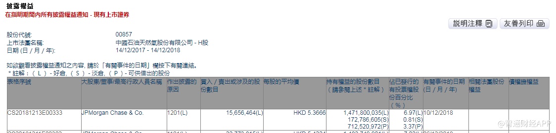 智通财经APP获悉,根据联交所资料显示,摩根大通于12月10日减持中国石油股份(00857)1565万股,每股作价5.3666港元,总值8398.73万港元,最新持股数减至14.71亿股,最新持股比例减至6.97%。
