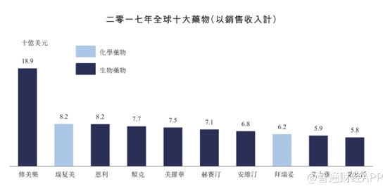 根据弗若斯特沙利文报告,2017年全球最畅销的10种药物销售收入总额为823亿美元,其中8种为生物药物,如下图所列:
