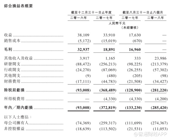 复宏汉霖截至2016年和2017年12月31日的毛利分别为3293.7万和1889.1万港元,年内亏损分别为9300.8万和37281.9万港元。