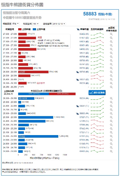 智通财经APP获悉,截至12月14日,恒指最新的牛熊街货比例54:46。从瑞信恒指牛熊证街货分布图中得到的数据显示,熊证街货重货区在26600-26699区间,该区间熊证数量为974张,比上一交易日减少108张;最多新增区间为26300-26399,新增张数为267。牛证中重货区在25000-25099区间,该区间最新牛证数量为1295张,比上一交易日增加89张;最多新增在26000-26058区间,新增331张。