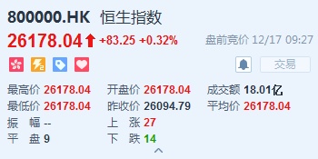 智通财经APP获悉,恒生指数开盘涨0.32%,报26178.04点。国企指数涨0.28%,报10388.22点。红筹指数涨0.12%,报4319.29点。大市盘前成交18.01亿港元。