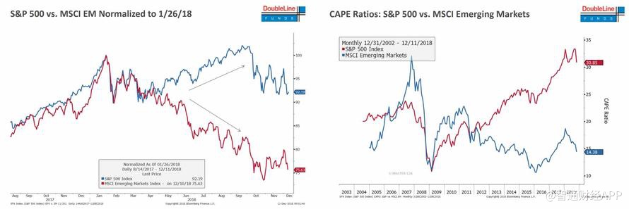 在12月11日的网络直播中,冈拉克指出,现阶段,新兴市场股市周期调整后的市盈率不到标普500指数市盈率的一半。但在过去的20年中,该指标曾比标普500的更高。他认为,单凭这一指标,以足够判断出新兴市场股市未来的涨幅可能会比美股高出100%。