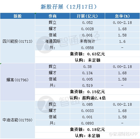 智通财经APP获悉,四川能投(01713)、耀高(01796)、中油洁能(01759)正在招股中。截至12月17日,辉立、耀才、信诚等多家券商为他们分别借出0.0558亿、0.519亿、0.18亿孖展金。其中,耀高(01796)超购逾2.4倍。
