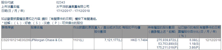 智通财经APP获悉,根据联交所资料显示,摩根大通于12月12日增持太平洋航运(02343)712万股,每股作价1.7484港元,总值1244.86万港元,最新持股数目约2.75亿股。