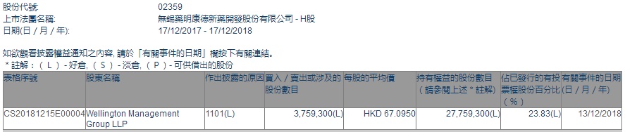 智通财经APP获悉,根据联交所资料显示,威灵顿资产管理于12月13日增持药明康德(02359)375万股,每股作价67.0950港元,总值2.5161亿港元,最新持股数目2775万股。