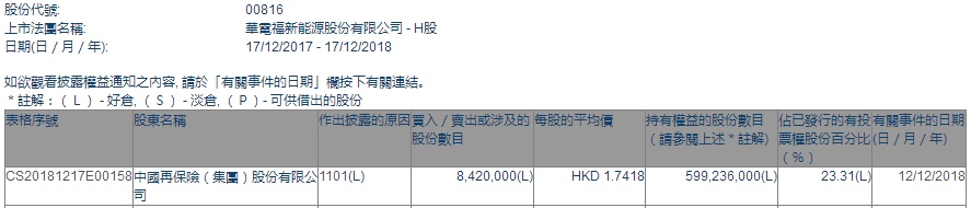 智通财经APP获悉,根据联交所资料显示,中国再保险于12月12日增持华电福新(00816)842万股,每股作价1.7418港元,总值1466.5956港元,最新持股数目约5.99亿股。