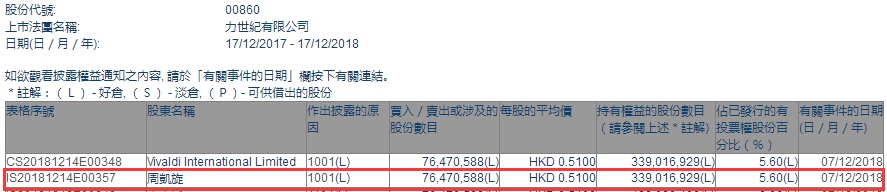 根据联交所资料显示,维港投资负责人周凯旋于12月7日增持力世纪(00860)7647.06万股,每股作价0.51港元,总值3900万港元,持股比例由原来的4.34%增长至5.6%,超过5%的首次申报股权门槛。