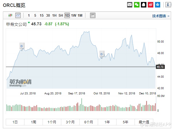 甲骨文昨日股价报收45.73美元,下跌1.87%。在随后的盘后交易中,受业绩超市场预期的影响,甲骨文股价上涨5.95%。