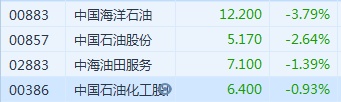 智通财经APP获悉,受国际油价拖累,港股石油股全线走弱。截至13时34分,中海油(00883)跌3.79%,报价12.2港元,中石油(00857)跌2.64%,报5.17港元,中石化(00386)跌0.93%,报6.4港元。