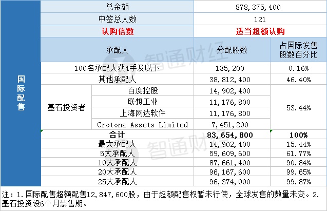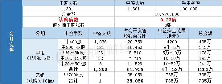 其中,公开配售申购人数1301,一手中签率100%,认购倍数0.23倍。