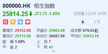 智通财经APP获悉,恒指早盘低开0.71%,报25903.98点。截至收盘,恒生指数跌273.73点或1.05%,报25814.25点,全日成交额达679.92亿。国企指数跌1.17%,报10230.52点,红筹指数跌2.04%,报4209.23点。