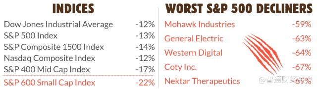 在众指数中,小型股指数标普600是目前唯一处于熊市的指数,中型股指数标普400较52周高点下跌了17%,逼近熊市边缘。虽然道指、标普500仍持稳调整区间,然而,许多市场参与者已经倾向于认为美股十年牛市已终结,熊市开始了。