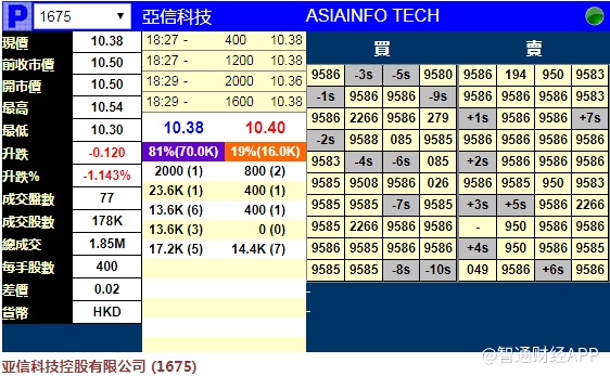 智通财经APP获悉,电信软件产品及相关服务供应商亚信科技(01675)将于12月19日挂牌,上市前夕,据辉立交易场资料显示,暗盘收报10.38港元,较招股价10.5港元,跌0.12港元或1.143%。成交量17.8万股,成交额为185万港元。每手400股,不计手续费,每手亏48港元。