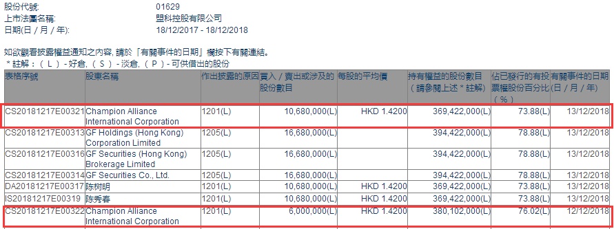 智通财经APP获悉,根据联交所资料显示,Champion Alliance International Corporation于12月12日及13日合共减持盟科控股(01629)1668万股,每股均作价1.42港元,总值2368.56万港元,最新持股数目约3.69亿股。