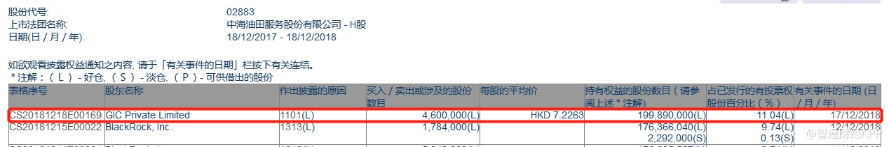 智通财经APP获悉,根据联交所资料显示,GIC Private Ltd于12月17日增持中海油田服务(02883)460万股,每股作价7.22港元,总值约3321.2万港元,最新持股量增至11.04%,最新持股数目约1.99亿股。