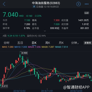 截至今日收盘,中海油田服务(02883)报7.04港元,跌2.22%。