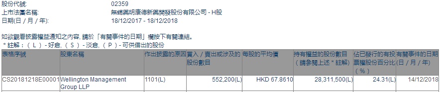 智通财经APP获悉,根据联交所资料显示,威灵顿资产管理于12月14日增持药明康德(02359)55万股,每股作价67.861港元,总值3732.36万港元,最新持股数目2831万股。