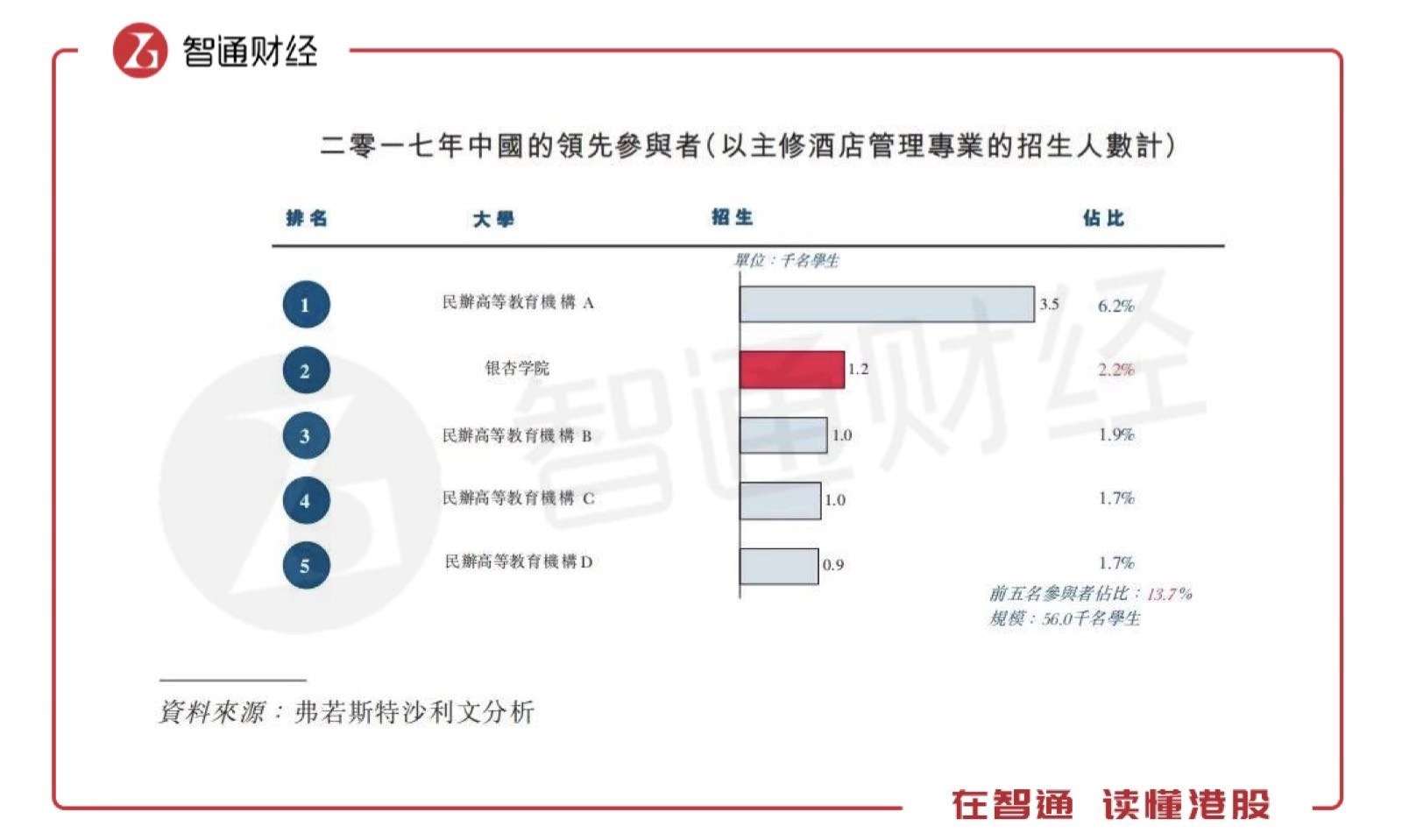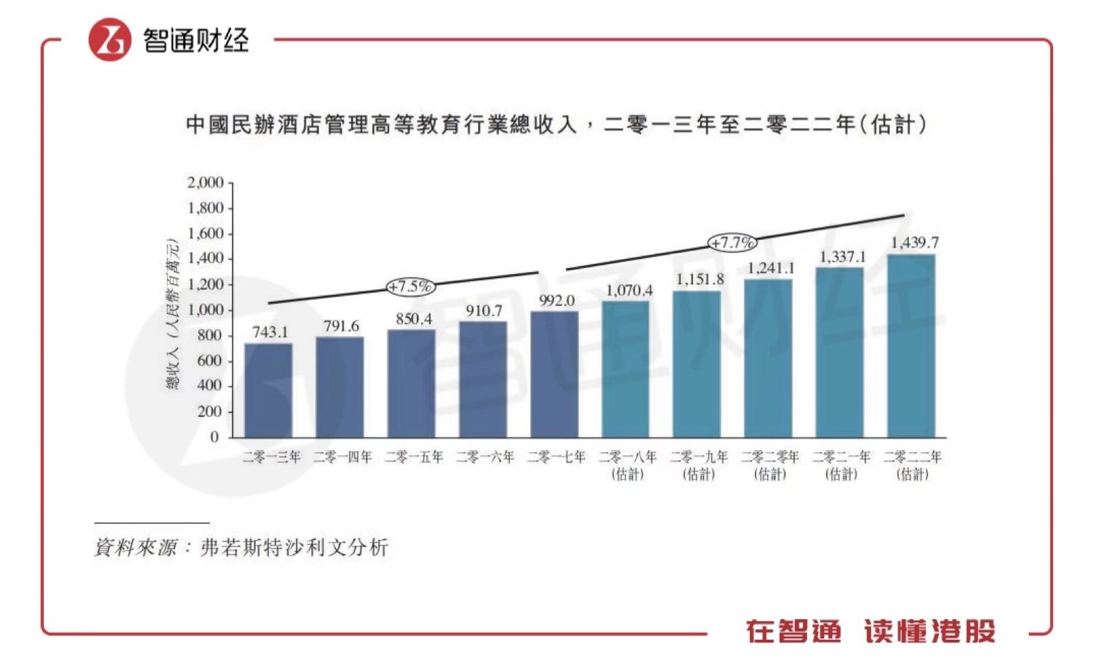 中国民办酒店管理高等教育行业的总收入在过去五年稳定增长。民办酒店管理高等教育行业的收入由2013年约7.43亿元元增至2017年约9.92亿元,复合年增长率约为7.5%。根据弗若斯特沙利文报告,预计2017年至2022年的总收入将继续按复合年增长率约7.7%增长,于2022年达到约14.4亿元。