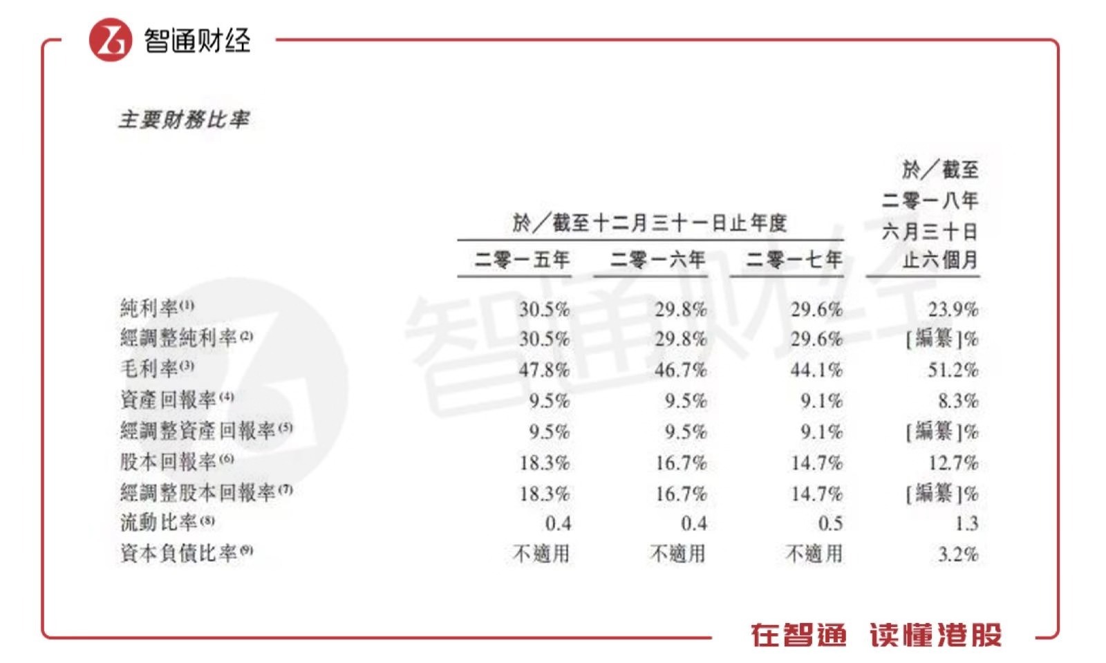 截至2015年、2016年及2017年12月31日止年度以及截至2017年及2018年6月30日止六个月的收益分别约为1.209亿元人民币(单位下同)、1.3亿元、1.39亿元、7330万元及8230万元。同期,公司的纯利分别约3680万元、3990万元、4120万元、2910万元及1970万元。公司净利润率长期保持在接近30%的水平。